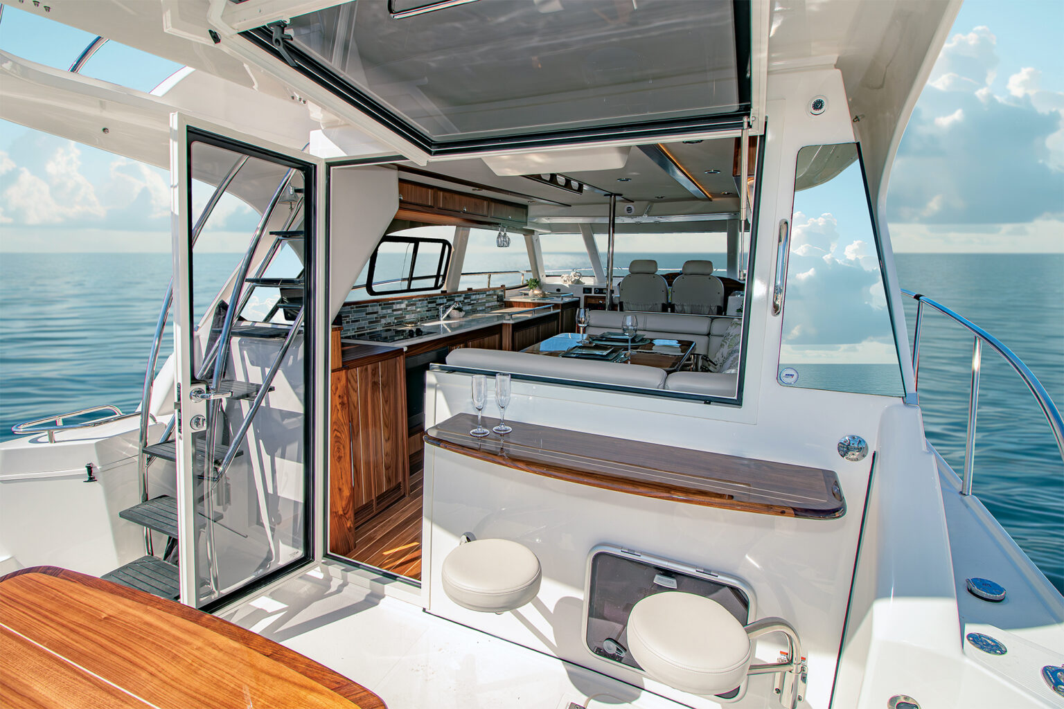 - Carbon-fiber hardtop (17x11 ft, 240 lb) offers weather protection on the flybridge without compromising weight distribution or overhead clearance.