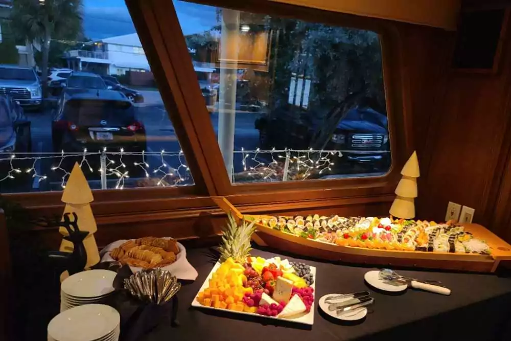 - External caterer with onboard setup: food prepared ashore and plated or presented on board.